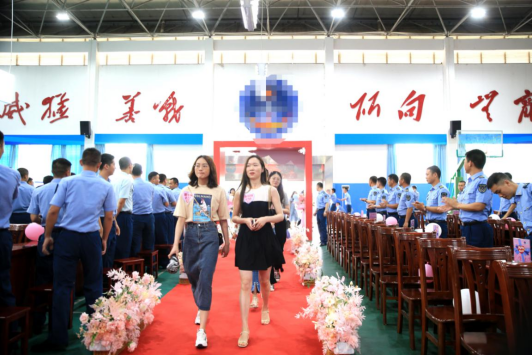 来到驻地后,映入眼帘的是粉色的气球和明媚的鲜花以及精心布置的会场,而兵哥哥们早已身着整齐划一的军装静候佳人,近百余名女嘉宾排成队依次进入现场,一进门,迎接她们的是缤纷落下的手持礼花筒炮以及热烈的欢呼与掌声,大家依次走到座位前与男嘉宾们面对面坐下。