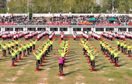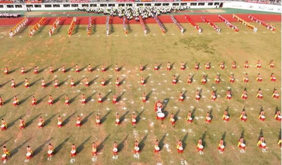 裁判员代表高欣、学生运动员代表毛润宇宣誓后,裁判员、运动员退场,“礼赞新时代——奋进新南华”大型文体表演将开幕式推向高潮。表演分为鼓舞中国、龙腾盛世、召唤青春、追梦南华四部分。整场表演以传承中华民族传统文化精神为核心,结合现代元素,将体育、文化、艺术高度融合,充分展现了南华师生继往开来、开拓进取的豪情壮志。民族大鼓《鼓舞中国》以大气雄浑的节奏为主旋律,配以整齐划一的口号声,充分展现南华学子积极进取、勇攀高峰的毅力与精神。龙狮表演《龙腾盛世》祥龙腾飞,龙狮共舞,逐珠跳跃,“巨龙”摆出的“核”“医”二字,展现了我校核特色与医品牌,彰显了南华人在科技与医疗领域的卓越追求与非凡成就。随着音乐的节奏,动感单车表演者们如同精灵般在单车上跳跃、旋转,充满了力量与节奏感,是一场力与美的结合,是运动与艺术的交融。团体操表演气势恢宏,场面壮观,仿佛一幅幅动态画卷在观众眼前徐徐展开,表演者们以“75”的造型,献礼祖国,传递深情与祝福。