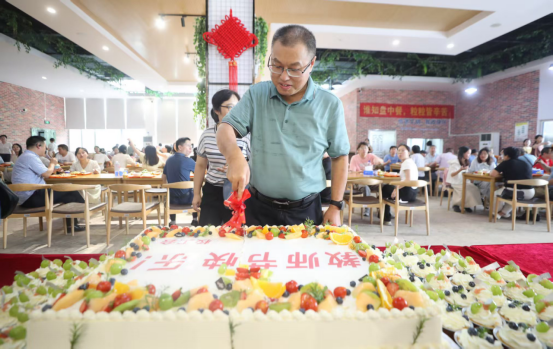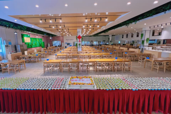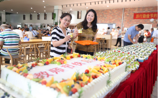 走进教工餐厅,温馨的节日氛围扑面而来。中央摆放的巨型蛋糕上,“教师节快乐”的字样格外醒目,传递出真挚的祝福;两侧整齐排列的水果蛋糕杯,造型精致、色泽诱人。工作人员亲切地问候每一位走进餐厅的老师:“老师,教师节快乐!请吃蛋糕!”并热情地递上一份香甜的蛋糕。