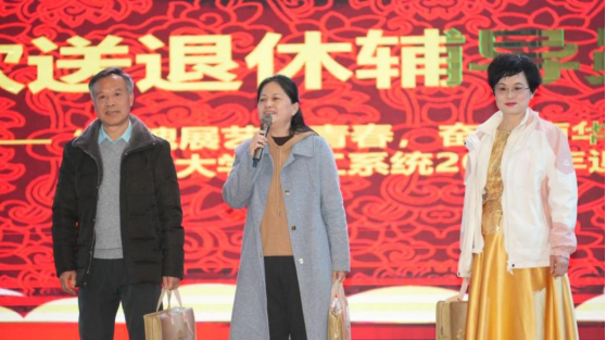 上半场精彩的表演过后,晚会举行了退休辅导员老师的荣休仪式,主持人带领着大家一起回顾了彭巧滢、秦洁几位退休辅导员辛勤耕耘的奋斗岁月,辅导员老师代表为退休老师送上礼物,同时退休老师也一一发表了感言。紧接着是新晋辅导员宣誓环节,在核科学技术学院党委副书记马军老师的领誓下,24名新加入南华学工大家庭的辅导员进行了庄严的辅导员誓词,“我志愿成为一名高校辅导员,拥护党的领导,献身教育事业,恪守职业规范,提升专业素养,情系学生成长,做好良师益友。为培养社会主义合格建设者和可靠接班人而努力奋斗!”洪亮而又豪迈的誓言里展现着新进辅导员们的决心和斗志。