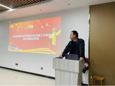 江柯桥详细介绍了经管法学院党建工作委员会的运行机制及章程,分享了对学生党员的发展、培养与使用。
